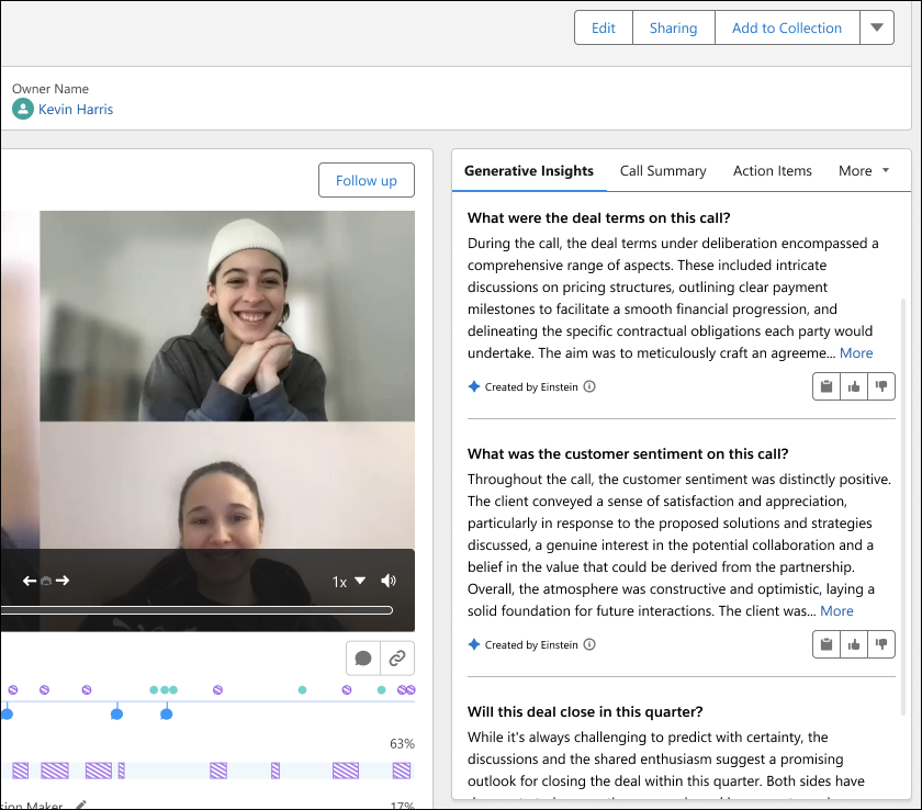 Be it information about customer sentiment or deal teams, Sales professionals can now quickly access it. They can record the video calls and ask questions to Einstein, who will then analyze the transcript and provide all the answers in a flash.
