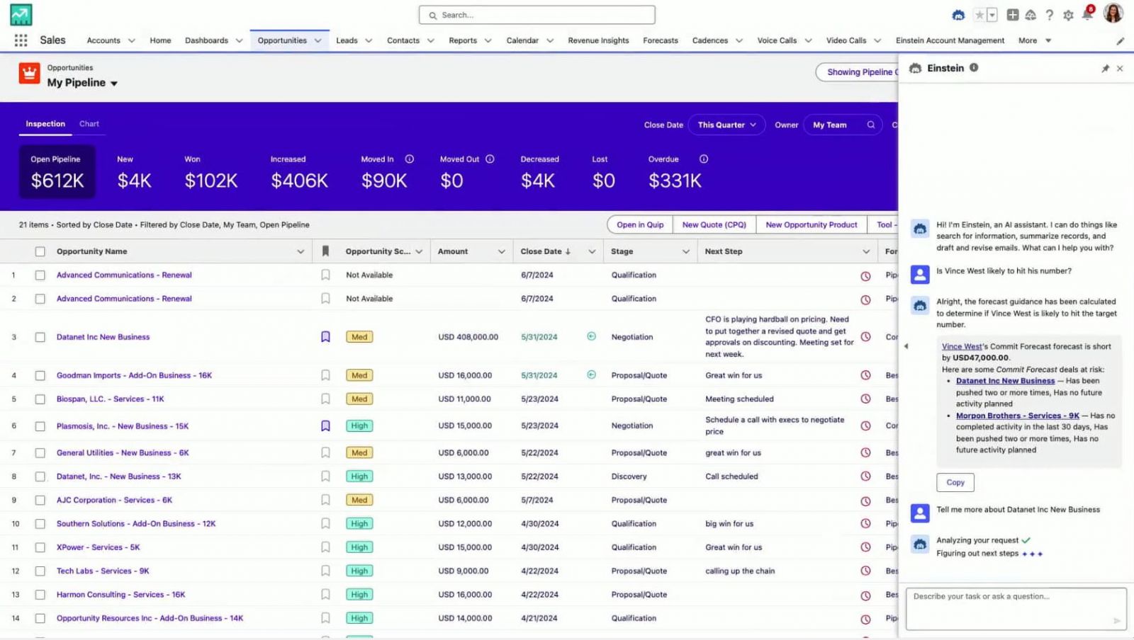With the intelligence of Pipeline Inspection, your sales teams can focus on the most important opportunities and forecast revenue more accurately. Pipeline Inspection has been providing your sales teams with a consolidated view of pipeline metrics, opportunities, week-to-week changes, AI-driven insights, close-date predictions, and activity information.